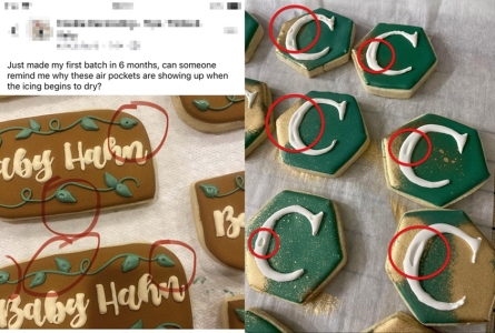Cratering refers to the formation of small depressions or pits on the surface of Royal Icing during the drying process. It occurs when air bubbles get trapped inside the medium during the application on the cookie. As RI dries and hardens, these air bubbles expand and create small craters on the surface. This is particularly frustrating because your project looks fine as you work on it, but as it dries, these craters start to form, and it becomes difficult to fill them in later.