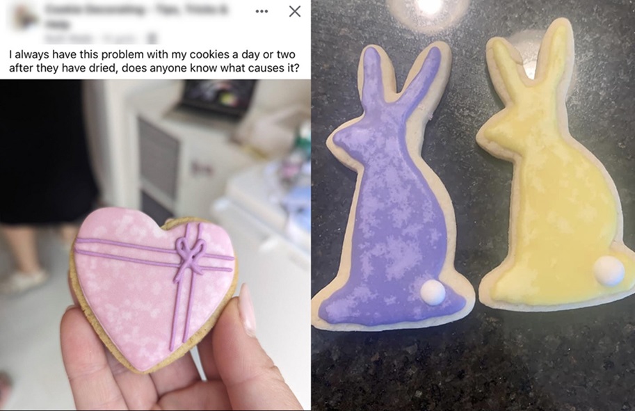 Spots (white, crystal-like or, on the contrary, darker with an oily look) can be particularly frustrating for cookie decorators, because they appear hours, and even days, after the cookie has been finished and tightly packed.